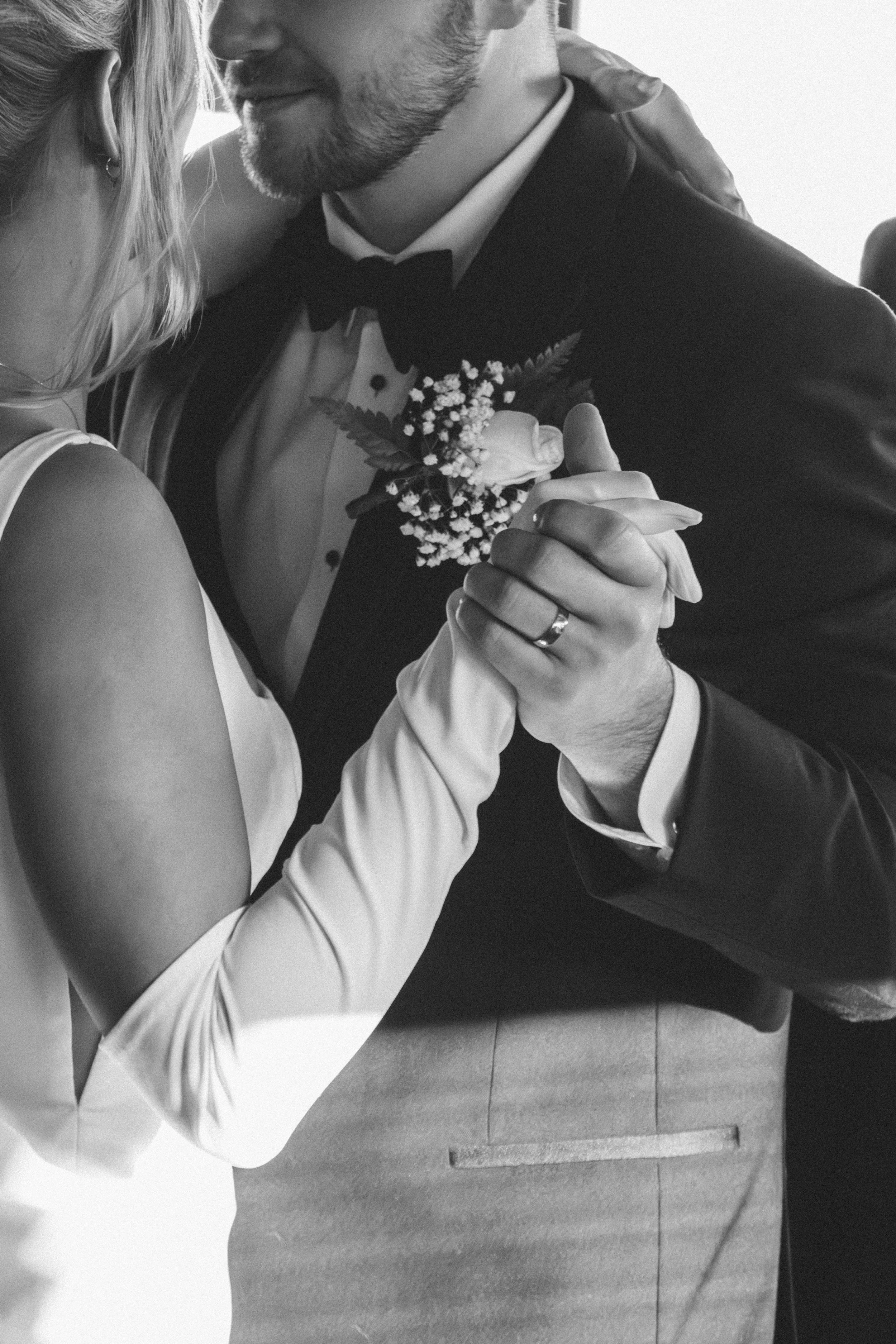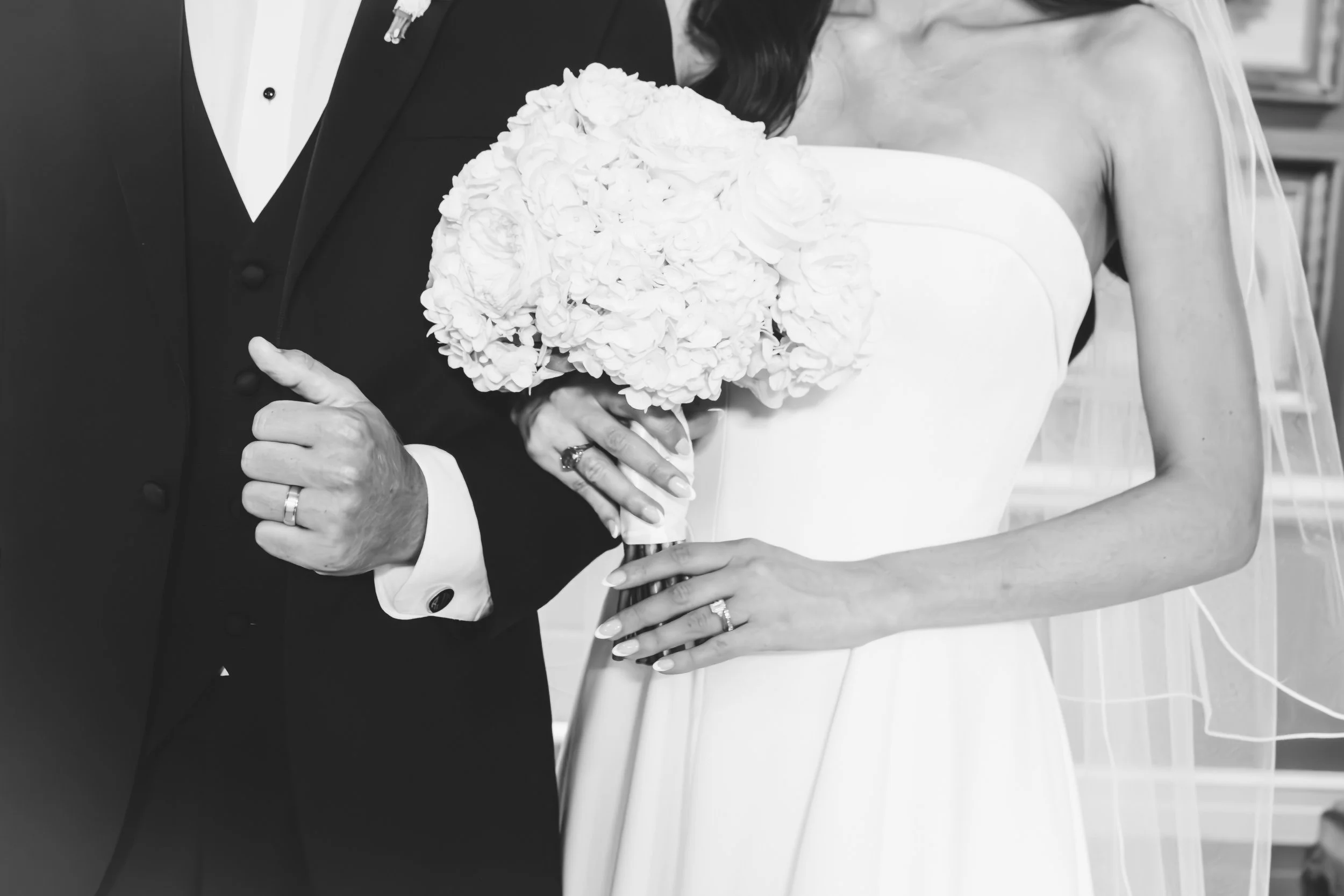 Two people holding hands, with one person wearing a ring and a bracelet, and the other person wearing a sweater and jeans. The image is in black and white.